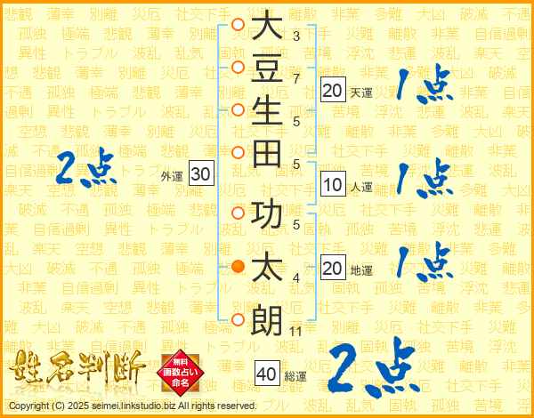 大(3画)豆(7画)生(5画)田(5画) 功(5画)太(4画)朗(11画)