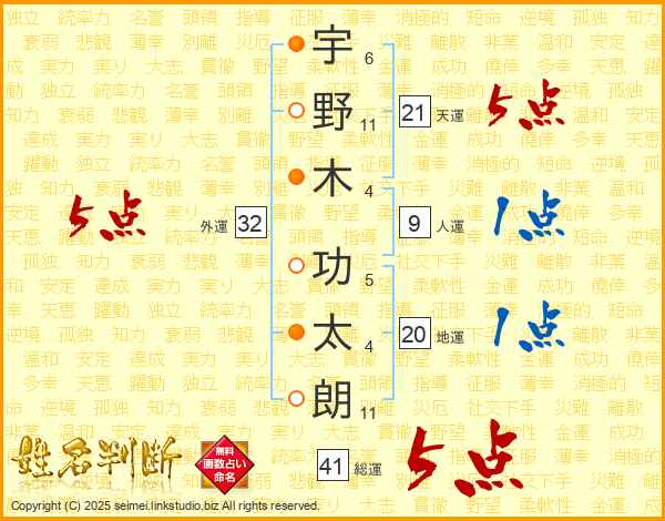 宇(6画)野(11画)木(4画) 功(5画)太(4画)朗(11画)