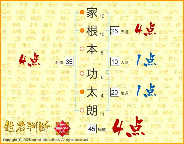 家(10画)根(10画)本(5画) 功(5画)太(4画)朗(11画)