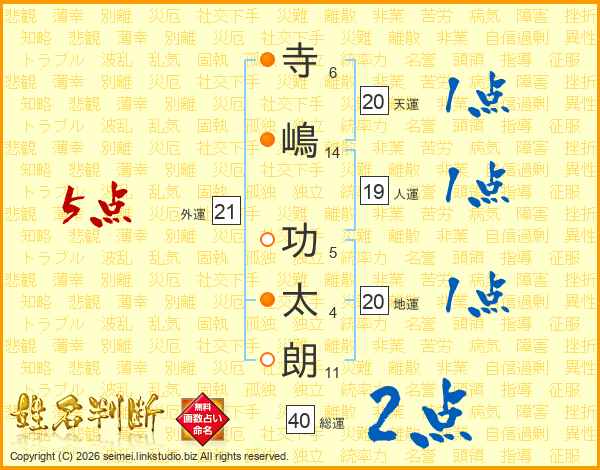 寺(6画)嶋(14画) 功(5画)太(4画)朗(11画)