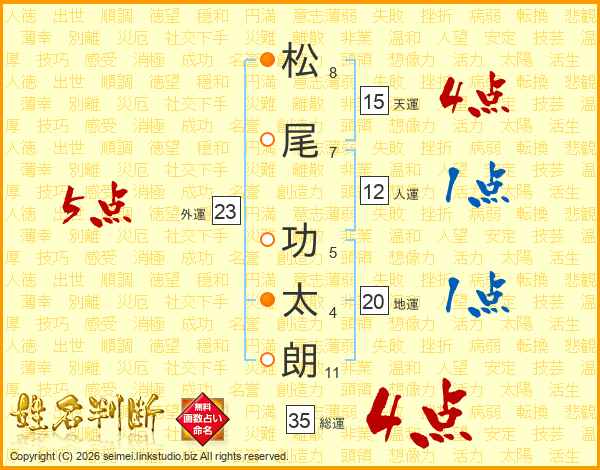 松(8画)尾(7画) 功(5画)太(4画)朗(11画)