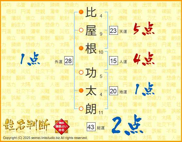 比(4画)屋(9画)根(10画) 功(5画)太(4画)朗(11画)