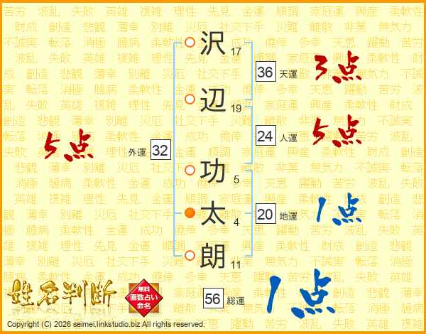 沢(17画)辺(19画) 功(5画)太(4画)朗(11画)