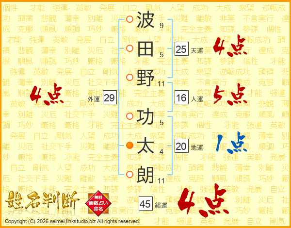 波(9画)田(5画)野(11画) 功(5画)太(4画)朗(11画)