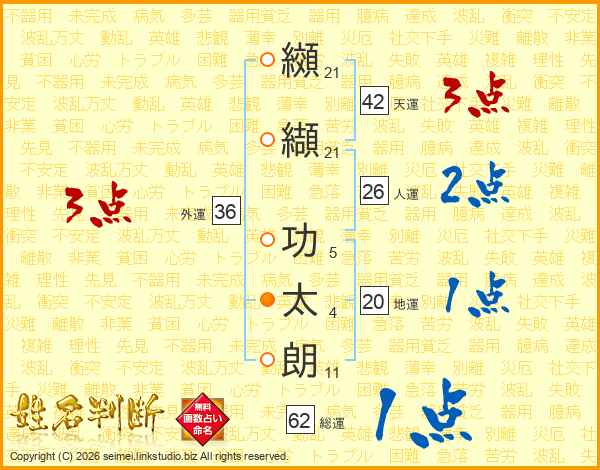 あなたの人生を表す1番重要な運勢です。生涯を通じて影響する総合運となり、主に50歳以降の晩年期に影響を及ぼします。苗字と名前の合計画数。