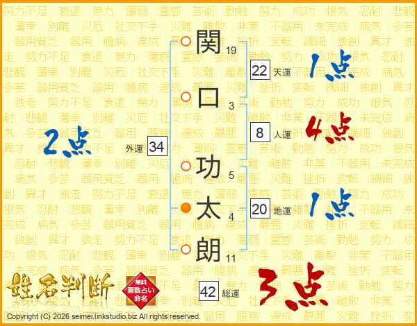 関(19画)口(3画) 功(5画)太(4画)朗(11画)