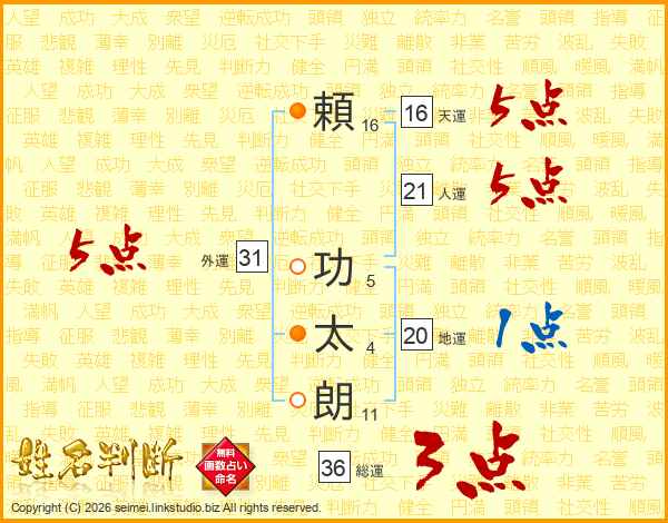 頼(16画) 功(5画)太(4画)朗(11画)