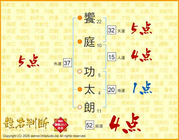 饗(22画)庭(10画) 功(5画)太(4画)朗(11画)