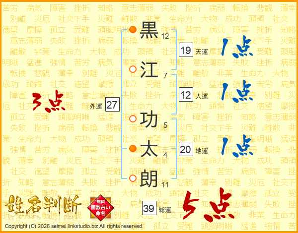 黒(12画)江(7画) 功(5画)太(4画)朗(11画)