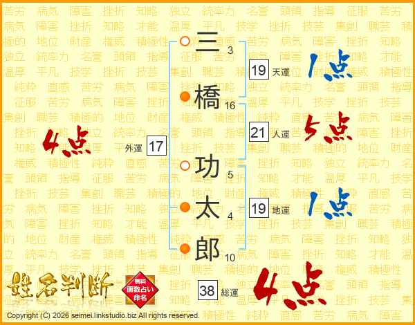 三橋功太郎さんの人運は21画の5点!