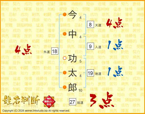 今(4画)中(4画) 功(5画)太(4画)郎(10画)
