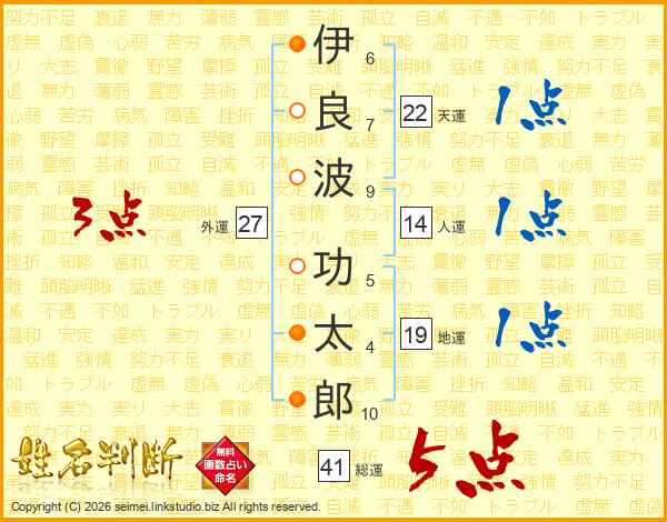 伊(6画)良(7画)波(9画) 功(5画)太(4画)郎(10画)