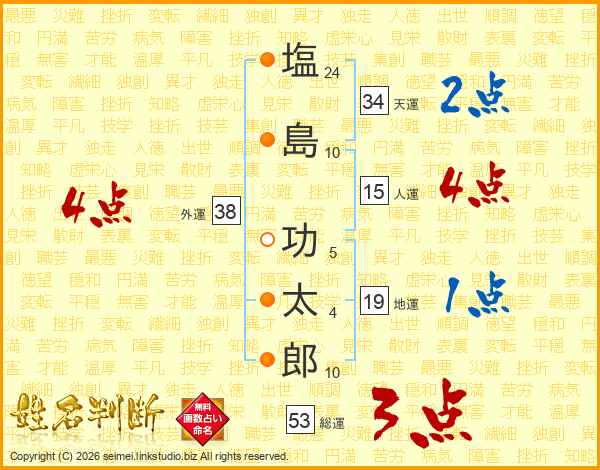 塩(24画)島(10画) 功(5画)太(4画)郎(10画)