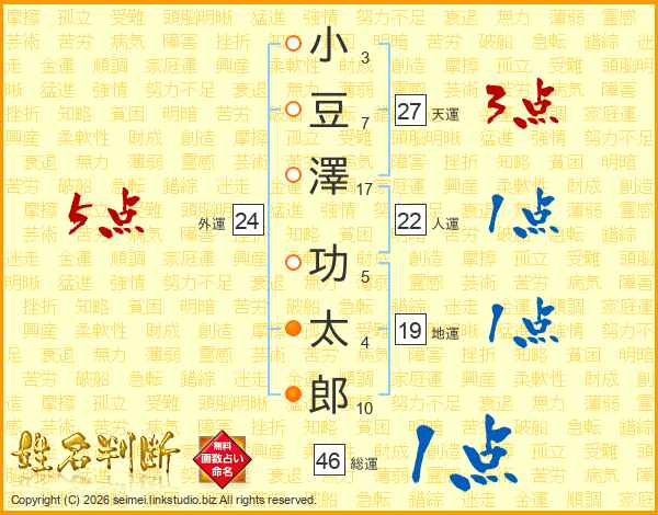 小(3画)豆(7画)澤(17画) 功(5画)太(4画)郎(10画)