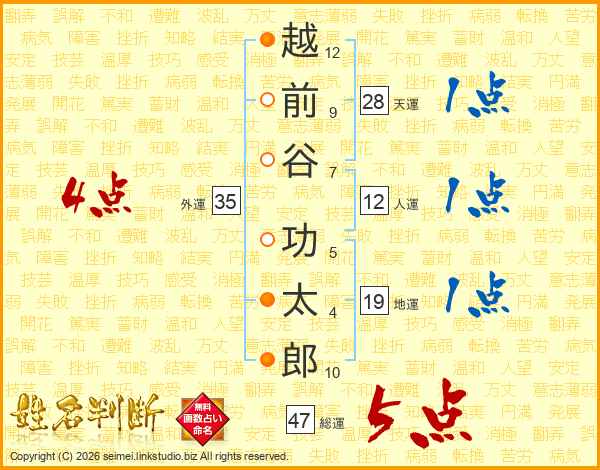 越前谷功太郎さんの総運は47画の5点!