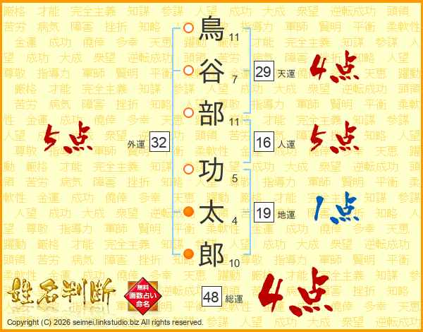 鳥(11画)谷(7画)部(11画) 功(5画)太(4画)郎(10画)