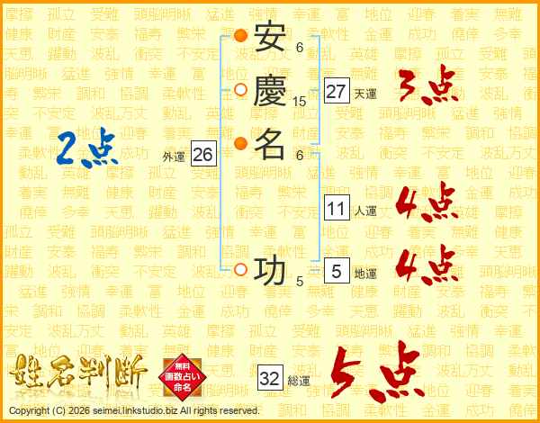 生活面を象徴する運勢です。外部から受ける影響力を表し、結婚運、家庭運や職場、環境への順応性を表します。総運から人運を引いた画数。姓や名が1文字の場合を除く。