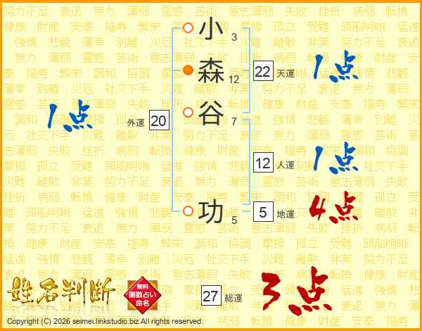 小(3画)森(12画)谷(7画) 功(5画)