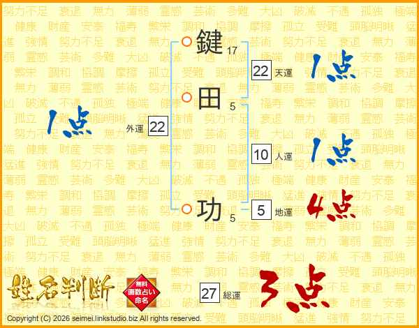 鍵田功さんの天運は22画の1点!