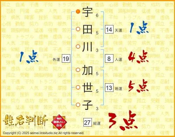 宇(6画)田(5画)川(3画) 加(5画)世(5画)子(3画)