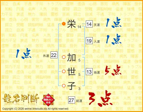 栄(14画) 加(5画)世(5画)子(3画)