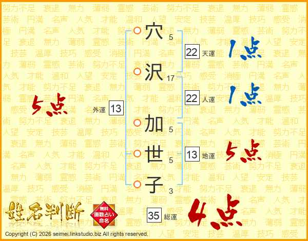 穴(5画)沢(17画) 加(5画)世(5画)子(3画)