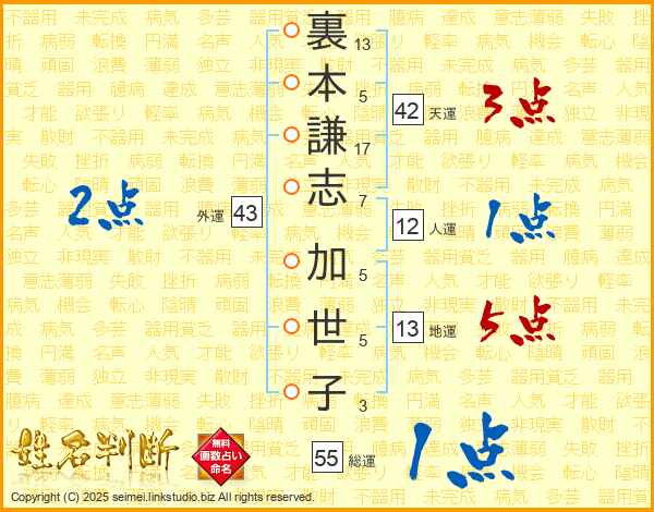裏(13画)本(5画)謙(17画)志(7画) 加(5画)世(5画)子(3画)