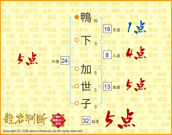 鴨下加世子さんの総運は32画の5点!