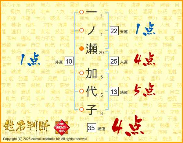 一(1画)ノ(1画)瀬(20画)  加(5画)代(5画)子(3画)