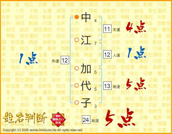 中(4画)江(7画) 加(5画)代(5画)子(3画)