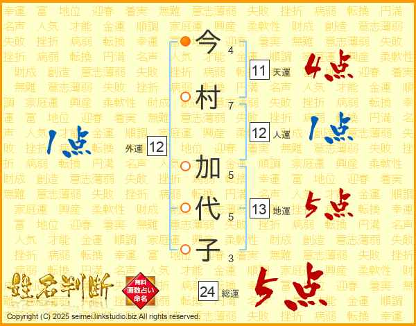 今(4画)村(7画) 加(5画)代(5画)子(3画)