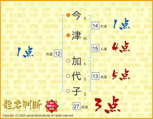 今(4画)津(10画) 加(5画)代(5画)子(3画)