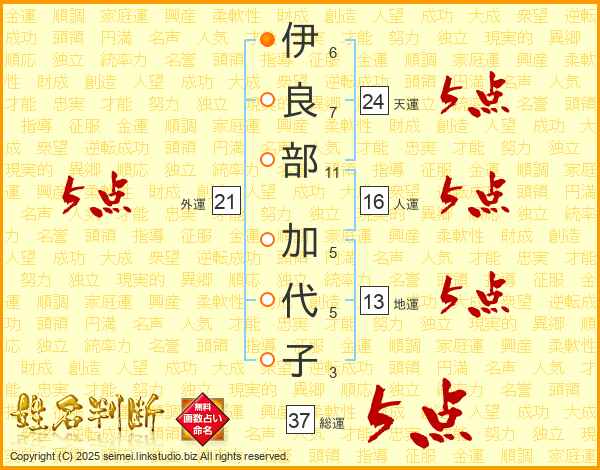 伊(6画)良(7画)部(11画) 加(5画)代(5画)子(3画)