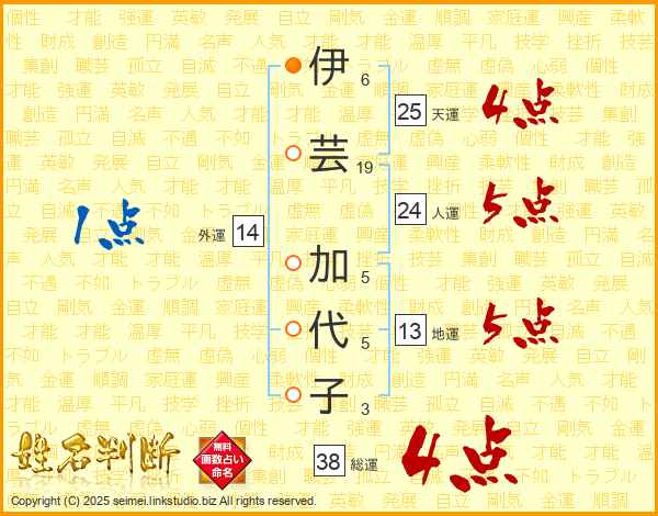 伊(6画)芸(19画) 加(5画)代(5画)子(3画)