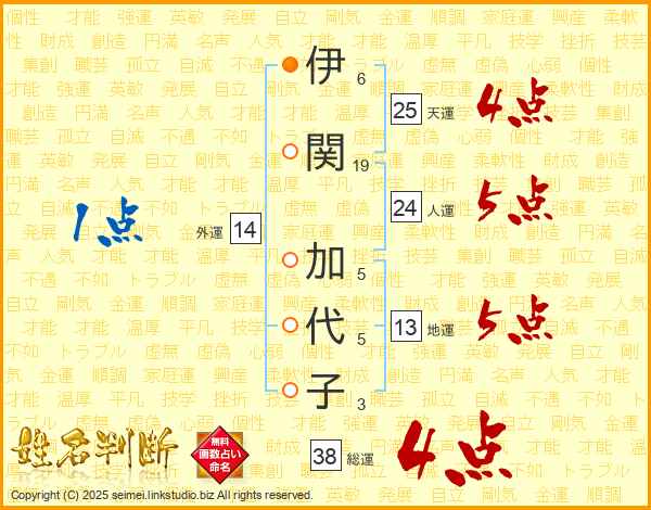 伊(6画)関(19画) 加(5画)代(5画)子(3画)