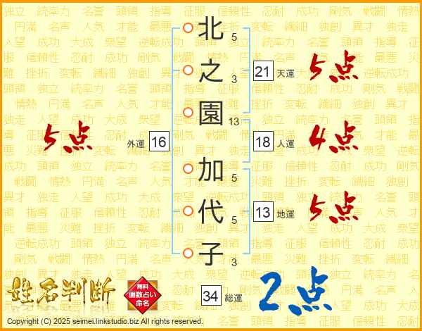 北(5画)之(3画)園(13画) 加(5画)代(5画)子(3画)