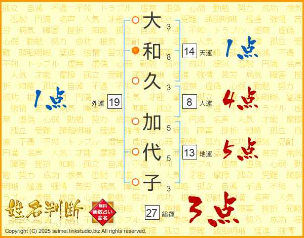 大(3画)和(8画)久(3画) 加(5画)代(5画)子(3画)