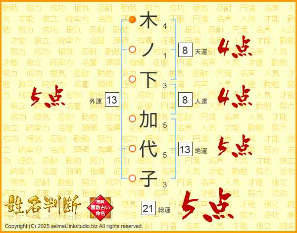 木ノ下加代子さんの総運は21画の5点!