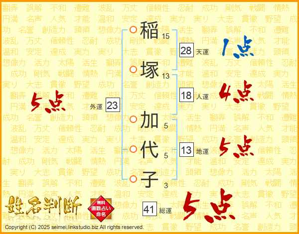 稲(15画)塚(13画) 加(5画)代(5画)子(3画)