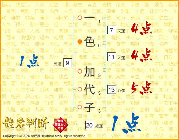 生活面を象徴する運勢です。外部から受ける影響力を表し、結婚運、家庭運や職場、環境への順応性を表します。総運から人運を引いた画数。姓や名が1文字の場合を除く。