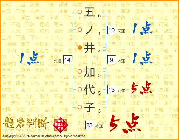 生活面を象徴する運勢です。外部から受ける影響力を表し、結婚運、家庭運や職場、環境への順応性を表します。総運から人運を引いた画数。姓や名が1文字の場合を除く。