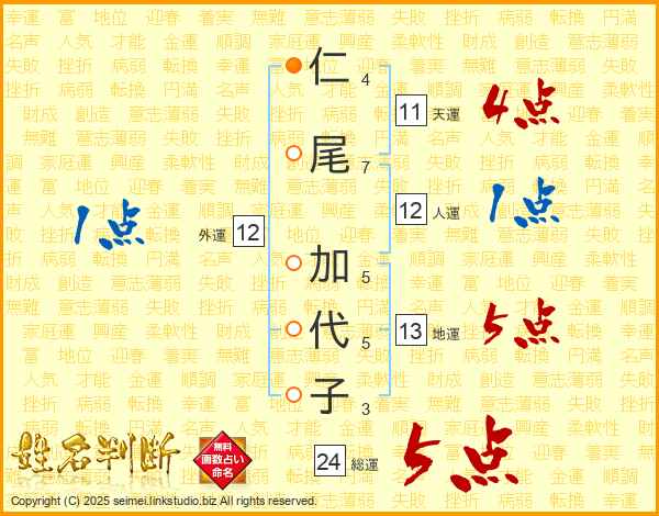 仁(4画)尾(7画) 加(5画)代(5画)子(3画)