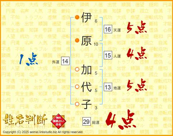 伊(6画)原(10画) 加(5画)代(5画)子(3画)