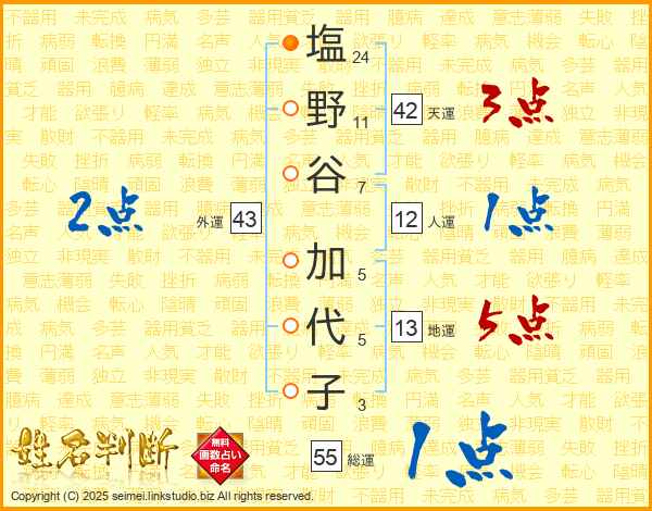 塩(24画)野(11画)谷(7画) 加(5画)代(5画)子(3画)