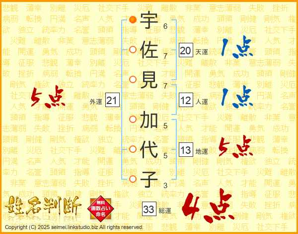 宇(6画)佐(7画)見(7画) 加(5画)代(5画)子(3画)