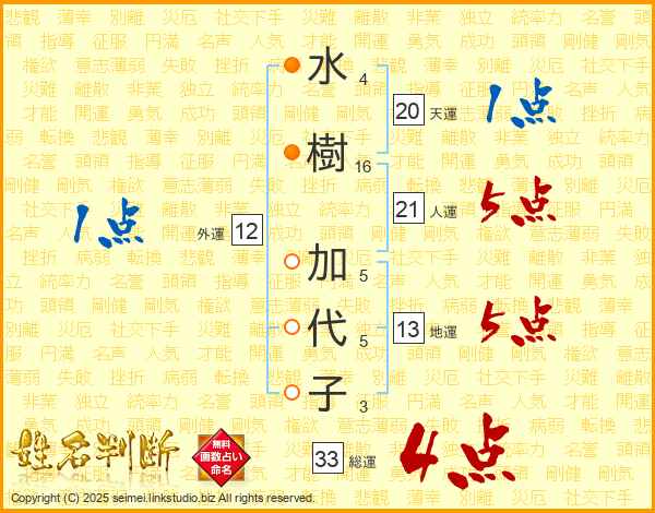 水(4画)樹(16画) 加(5画)代(5画)子(3画)