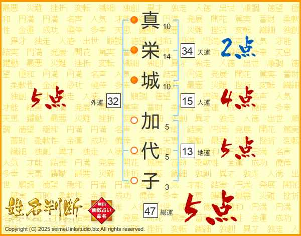 真(10画)栄(14画)城(10画) 加(5画)代(5画)子(3画)