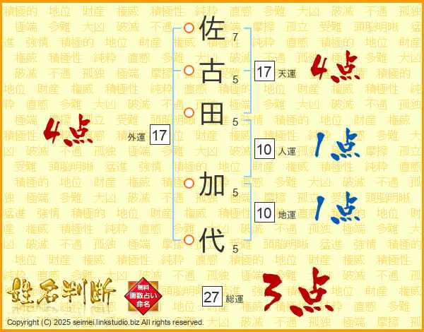 佐(7画)古(5画)田(5画) 加(5画)代(5画)
