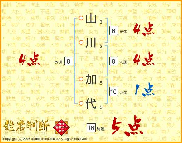 生活面を象徴する運勢です。外部から受ける影響力を表し、結婚運、家庭運や職場、環境への順応性を表します。総運から人運を引いた画数。姓や名が1文字の場合を除く。