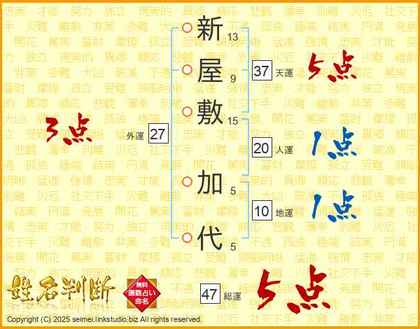 新(13画)屋(9画)敷(15画) 加(5画)代(5画)